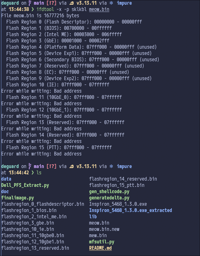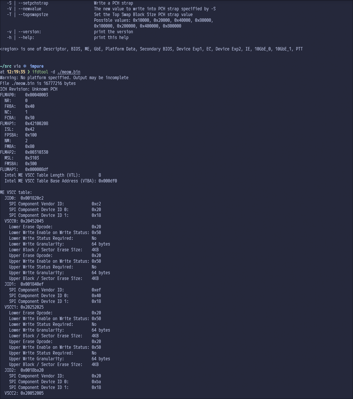 From here, I followed the instructions in the deguard README, producing this commit in the process. You can use a patched version of the Intel Management Engine to produce the deltas and this was something prior that was unclear to me, and an interpretation another friend of mine had. It isn’t the case that it has to also be vulnerable, at all!